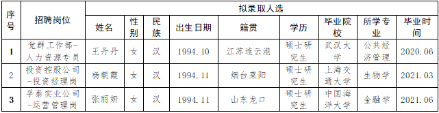 按照2020年8月28日發(fā)布的《2020年煙臺財金集團面向“雙一流”和全球TOP200高校畢業(yè)生公開招聘簡章》相關(guān)規(guī)定,經(jīng)過簡歷收集、資格審查、初試、復試、集體決策等環(huán)節(jié),擬確定部分崗位錄取人選(詳見下表),現(xiàn)予以公示,公示期為5個工作日(11月10日至11月17日)。